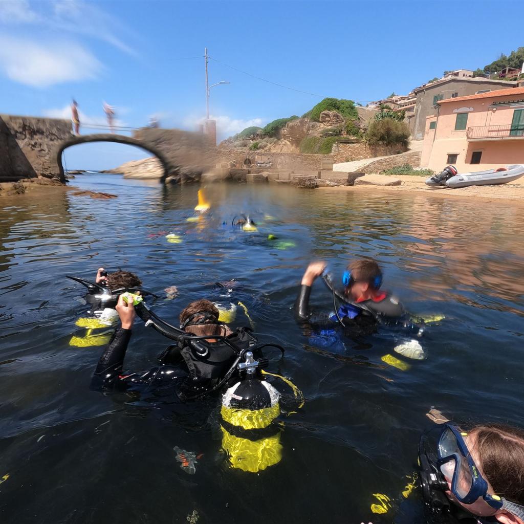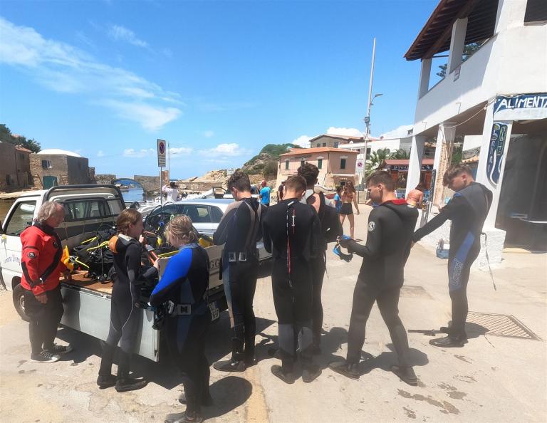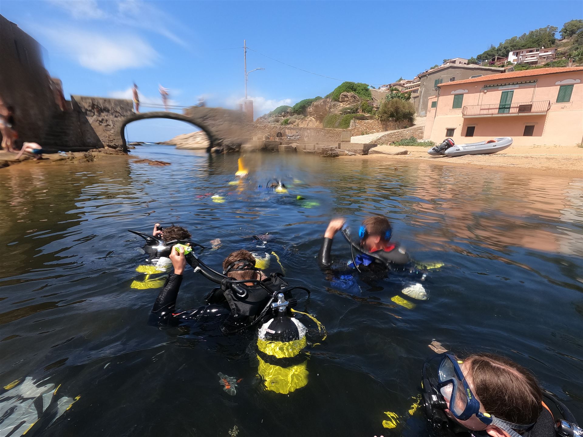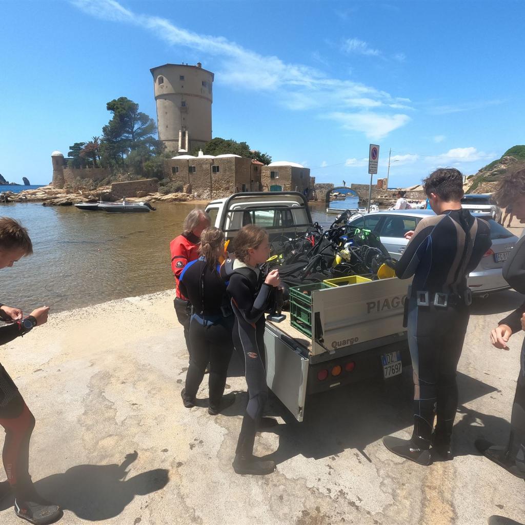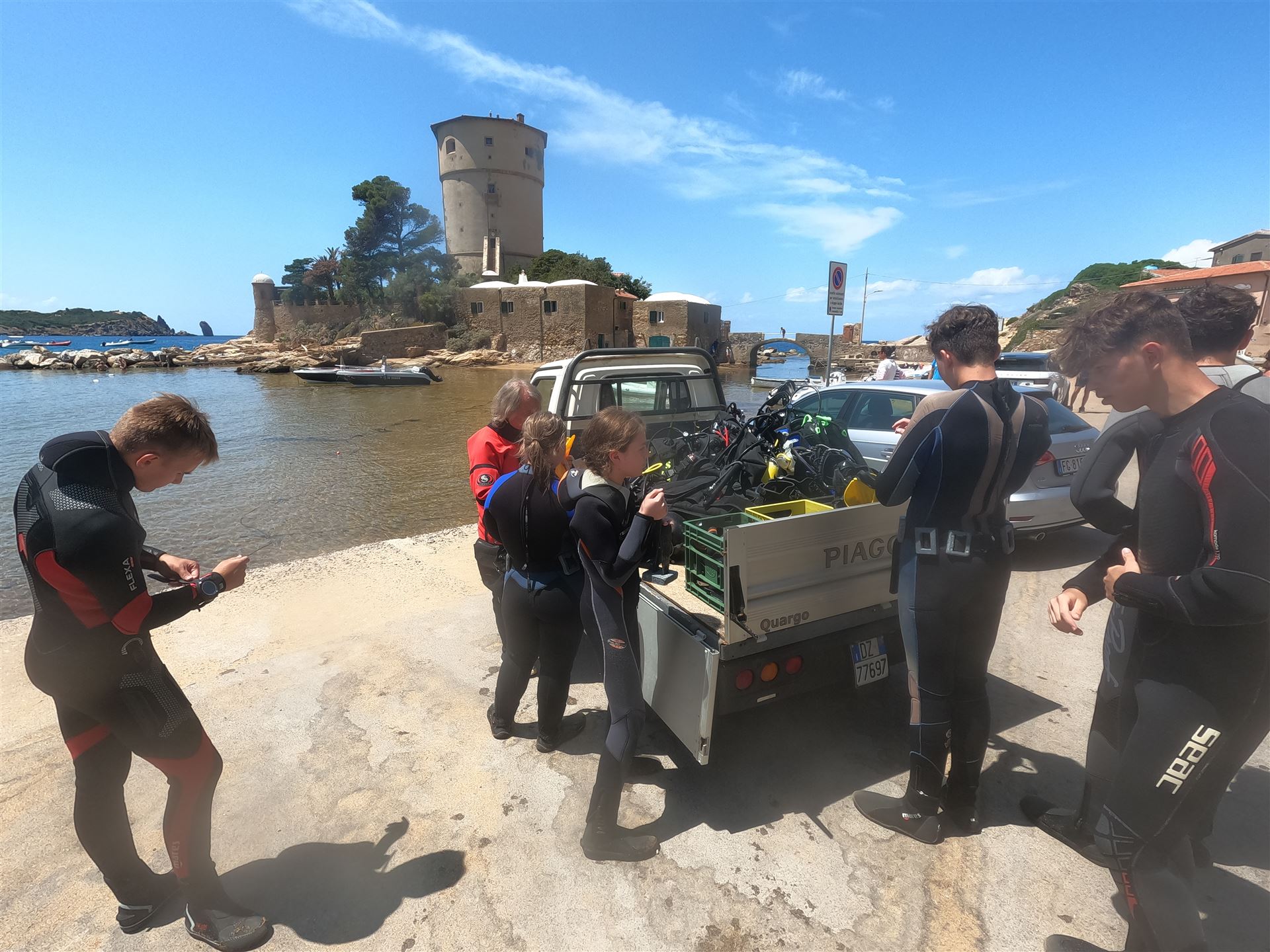 Der Tauchtag hat für unsere Gruppe heute erst um 8 Uhr begonnen, da das Brot ausgegangen ist. Aufgrund des ursprüglich für nachmittags angekündigten Gewitters, war heute leider nur ein Tauchgang möglich. Für den Tauchgang wurde eine kleine Übung eingeplant. Diese bestand darin, das Gerät unter Wasser komplett auszuziehen und wieder anzuziehen. Die Steigerung war es, bevor man das Gerät wieder anzieht ein paar Meter vom Gerät weg zu tauchen. Das hat bei allen funktioniert. Der ursprüngliche Plan, nach dem Tauchen einen Ausflug nach Giglio Castello zu machen, musste nach einem misslungenen Kochversuch, verworfen werden. Nach dem Essen hatten wir Zeit zur freien Verfügung. Die "Challenge of the Day" war, dass sich alle die Bedienungsanleitung ihres Tauchcomputers durchlesen.