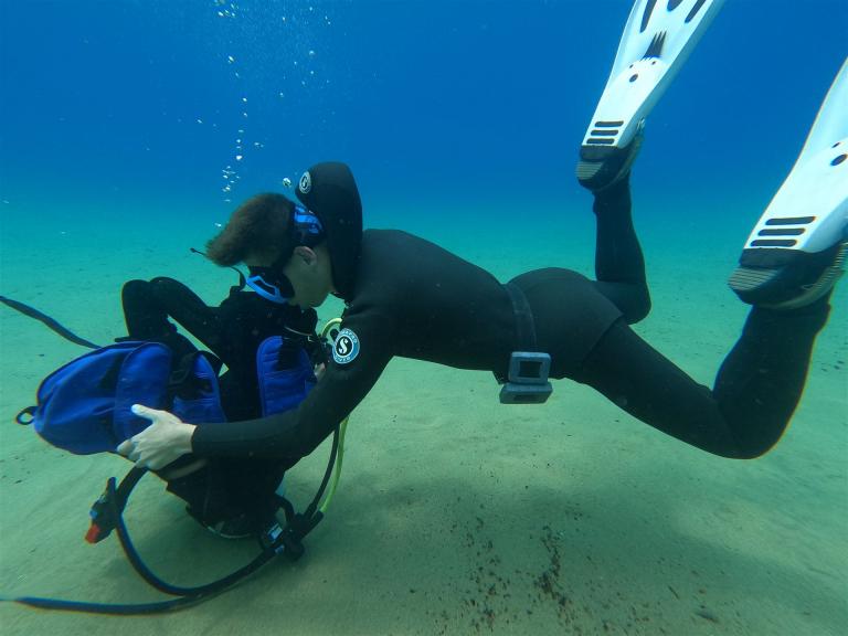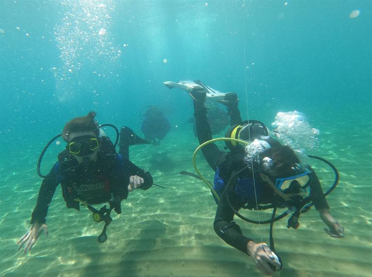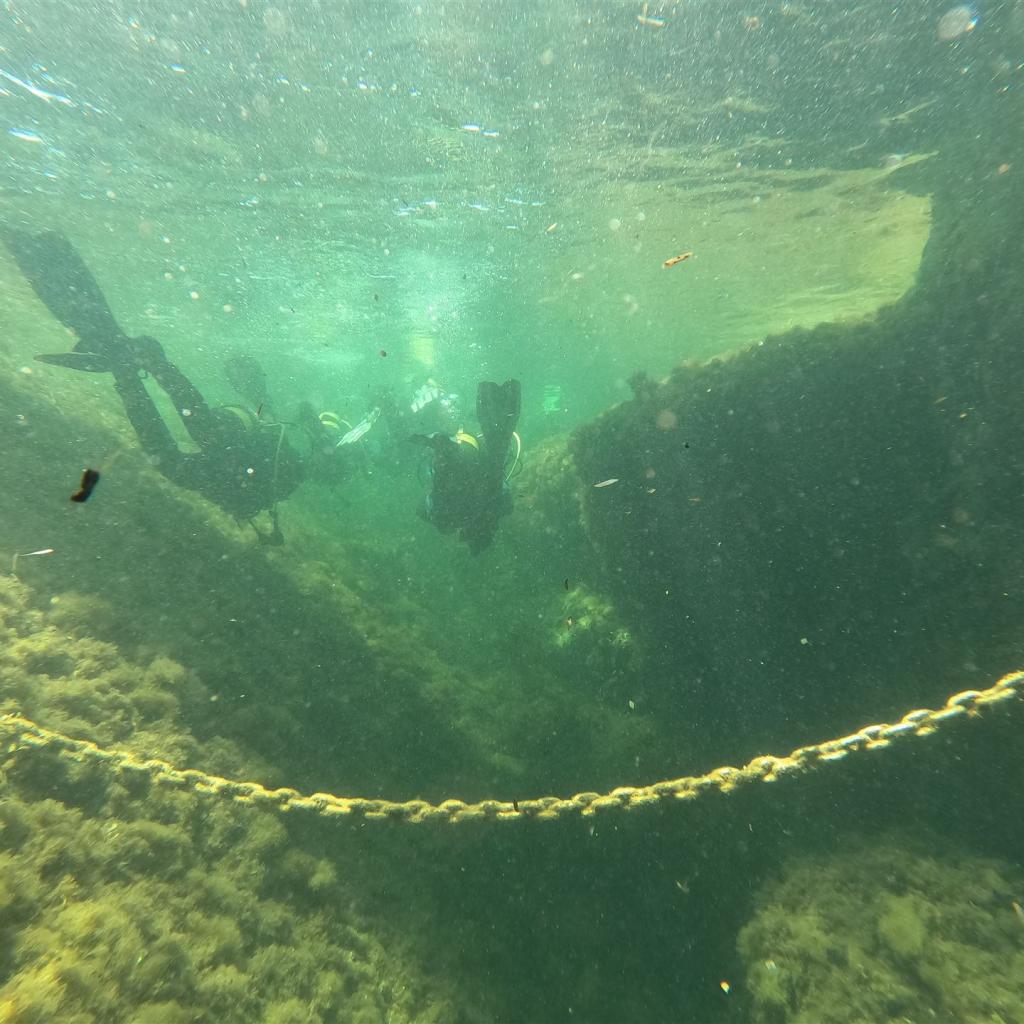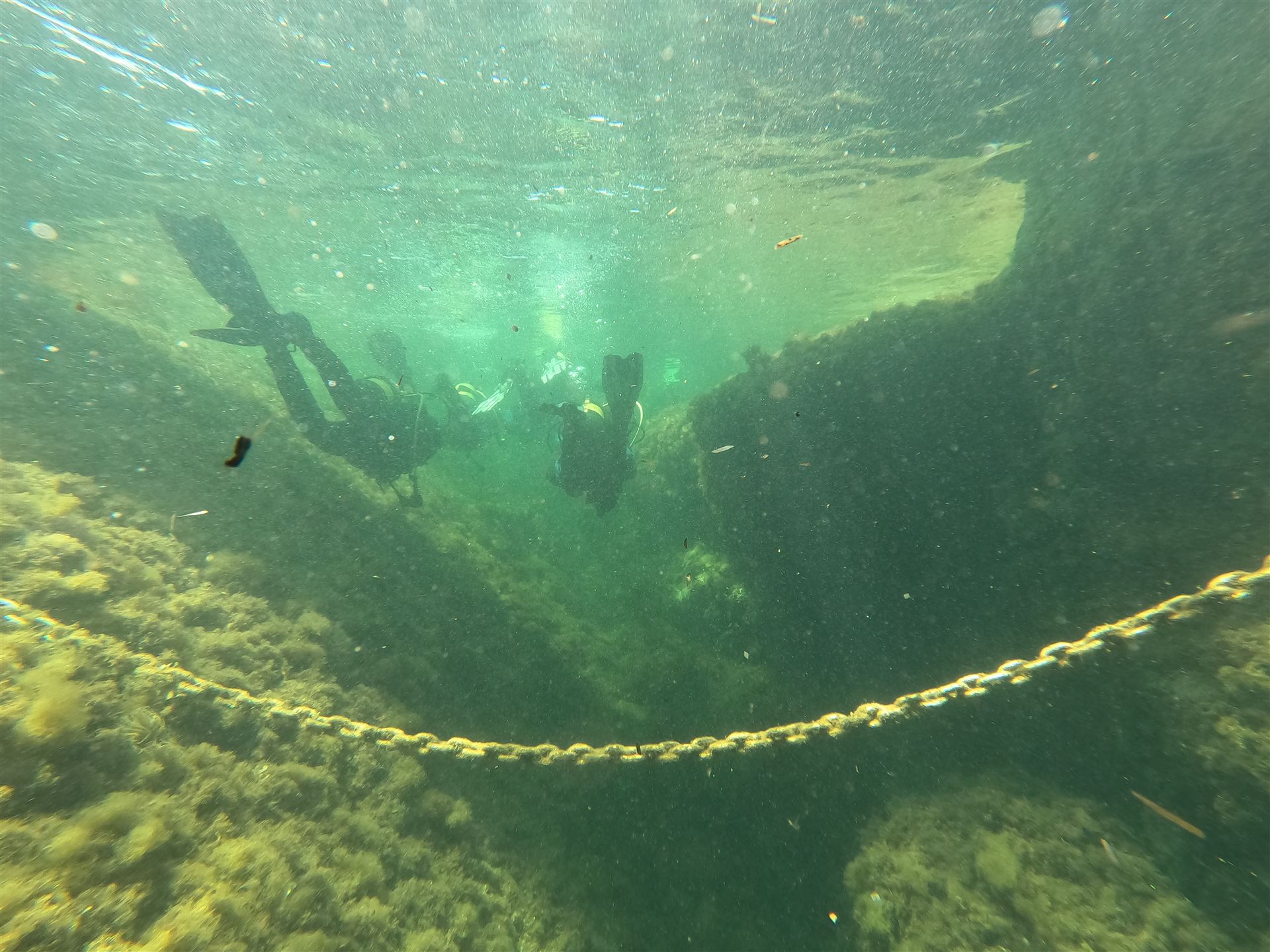 Wir haben morgens beim Aufrödeln für den ersten Tauchgang die Challenge, den Flaschengurt am Jacket richtig einzufädeln. Wir sind vom Strand aus ins Wasser und dann zum Steinturm und einmal um ihn herum. Nach der Runde sind wir zurück an den Strand getaucht und abgerödelt. Für den zweiten Tauchgang haben fünf von uns das Gerät aufgerödelt und der Rest ist am Strand oder an der Tauchbasis geblieben. Für den zweiten Tauchgang sind wir mit dem Boot rausgefahren und sind beim Tauchplatz Drachenhöhle ins Wasser gegangen. Bei leichter Strömung haben wir mehrere Muränen und Oktopoden gesehen. Außerdem haben wir viele verschiedene Fische gesehen. Nach ungefähr einer halben Stunde sind wir mit dem Boot zurück gefahren und haben abgerödelt. Am Ende des Tages haben wir uns Hotdogs gemacht.