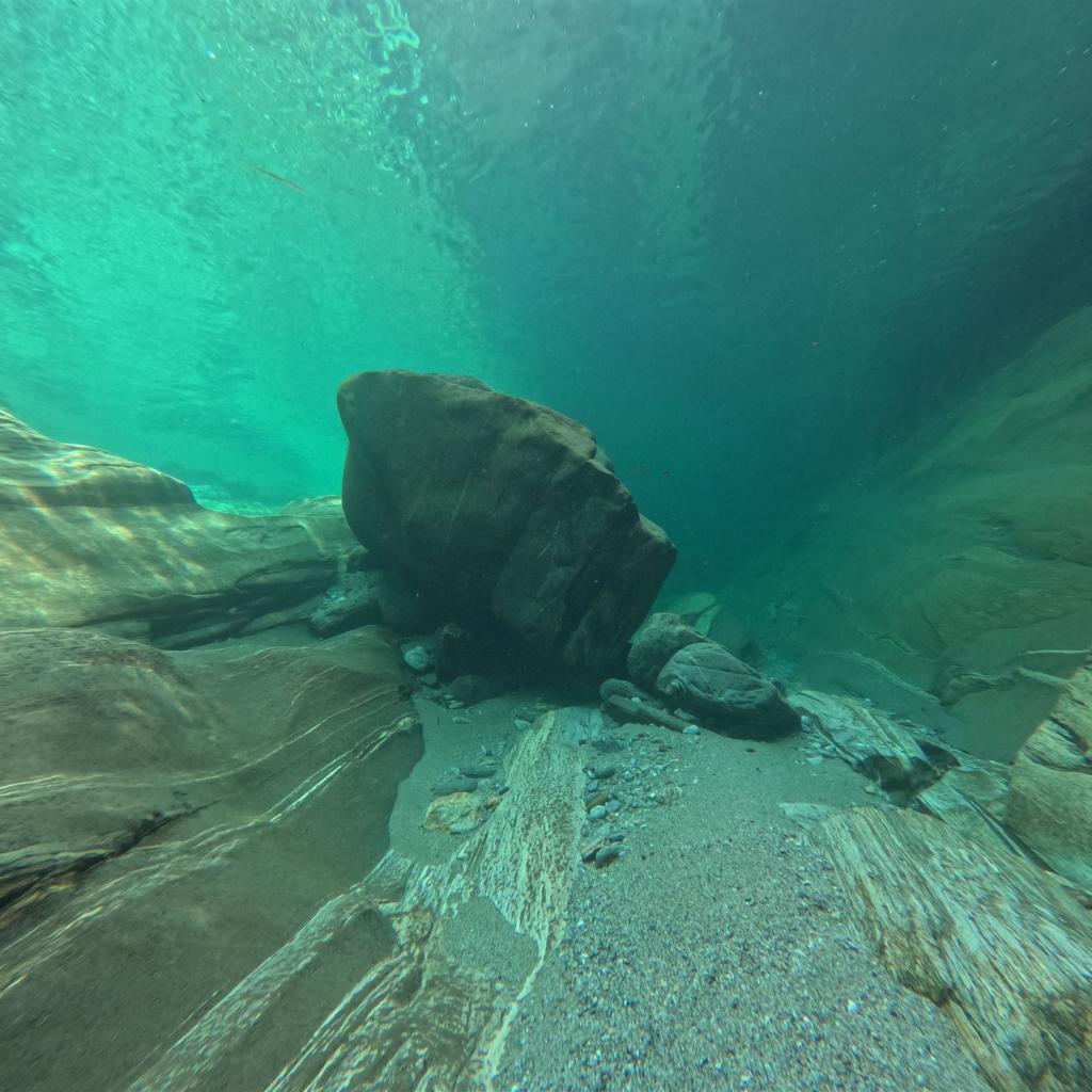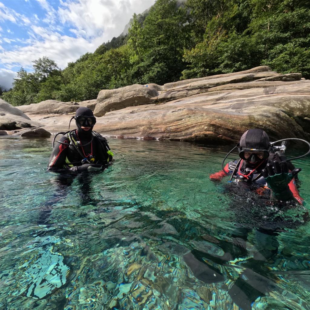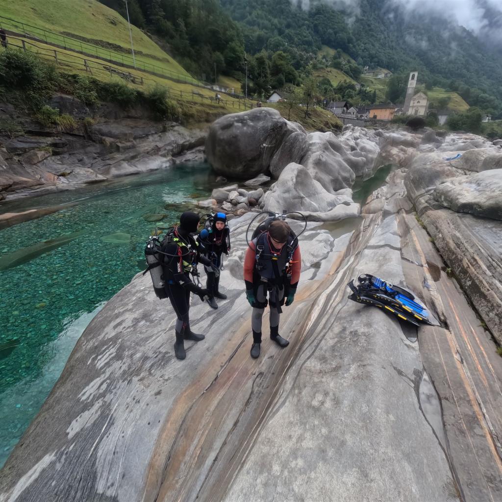 Nachdem wir mit der Jugendgruppe unseres Vereins knapp zwei Wochen beim Tauchcamp auf der Insel Giglio verbracht hatten, ging es wieder zurück nach Hause. Zwischenübernachtung machten wir in der Südschweiz. Zum einen ist das die Hälfte der Strecke und macht die lange Autofahrt etwas erträglicher. Der Ort bei Locarno wurde aber auch aufgrund eines besonderen Tauchplatzes gemacht, den man dort erleben kann: der Fluss Verzasca. Die Jahreszeit war optimal, die Verzasca führte genug Wasser für einen problemlosen Tauchgang. Andererseits war der Wasserstand und damit die Fließgeschwindigkeit niedrig genug, um ohne Sicherheitsleine tauchen zu können. Auch das Schwimmen gegen die Strömung war mit etwas Flosseneinsatz problemlos möglich und die Wassertemperatur mit angenehmen 15 Grad deutlich höher als erwartet. Als Tauchplatz hatten wir uns die Römerbrücke (ital. ponte dei salti, Brücke der Sprünge) ausgesucht. Zwischen einem Wasserfall und einer Flachstelle im Fluss gab es ein etwa 100 Meter langes und maximal neun Meter tiefes Becken, in dem wir abtauchen konnten. Der Abstieg zum Fluss mit der Ausrüstung auf dem Rücken war eine kleine Herausforderung.