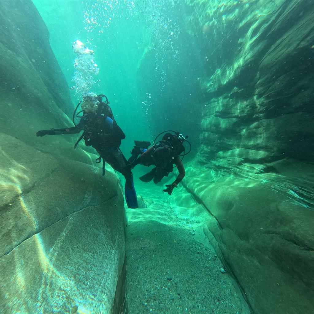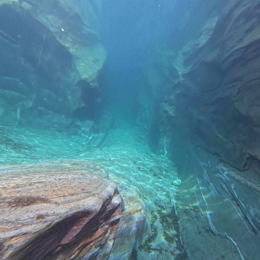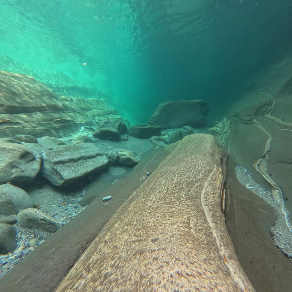 Nachdem wir mit der Jugendgruppe unseres Vereins knapp zwei Wochen beim Tauchcamp auf der Insel Giglio verbracht hatten, ging es wieder zurück nach Hause. Zwischenübernachtung machten wir in der Südschweiz. Zum einen ist das die Hälfte der Strecke und macht die lange Autofahrt etwas erträglicher. Der Ort bei Locarno wurde aber auch aufgrund eines besonderen Tauchplatzes gemacht, den man dort erleben kann: der Fluss Verzasca. Die Jahreszeit war optimal, die Verzasca führte genug Wasser für einen problemlosen Tauchgang. Andererseits war der Wasserstand und damit die Fließgeschwindigkeit niedrig genug, um ohne Sicherheitsleine tauchen zu können. Auch das Schwimmen gegen die Strömung war mit etwas Flosseneinsatz problemlos möglich und die Wassertemperatur mit angenehmen 15 Grad deutlich höher als erwartet. Als Tauchplatz hatten wir uns die Römerbrücke (ital. ponte dei salti, Brücke der Sprünge) ausgesucht. Zwischen einem Wasserfall und einer Flachstelle im Fluss gab es ein etwa 100 Meter langes und maximal neun Meter tiefes Becken, in dem wir abtauchen konnten. Der Abstieg zum Fluss mit der Ausrüstung auf dem Rücken war eine kleine Herausforderung.
