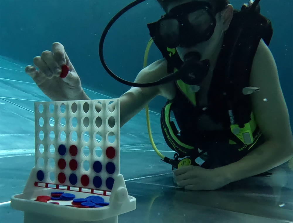 Unser Tauchkollege Tim hat angefangen, mit seinem 3D-Drucker wasserfeste Versionen verschiedener Spiele herzustellen. Bisher im Programm sind Jenga und 4-gewinnt. Zum Einsatz kommen die auch beim Jugendtraining.