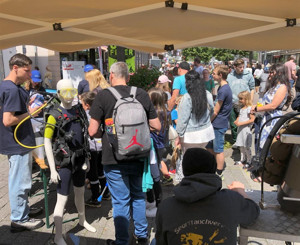 Beim Spiel- und Sportfest in Heinsberg haben sich auch viele Sportvereine mit einem Angebot vorgestellt. Bei uns konnten die Teilnehmer nach kleinen Fischen "tauchen", Kinder ab acht Jahre das auch mit Atemregler im Mund. Das Interesse der Besucher am Tauchen und unserem Verein war sehr groß, es gab viele interessante Gespräche.