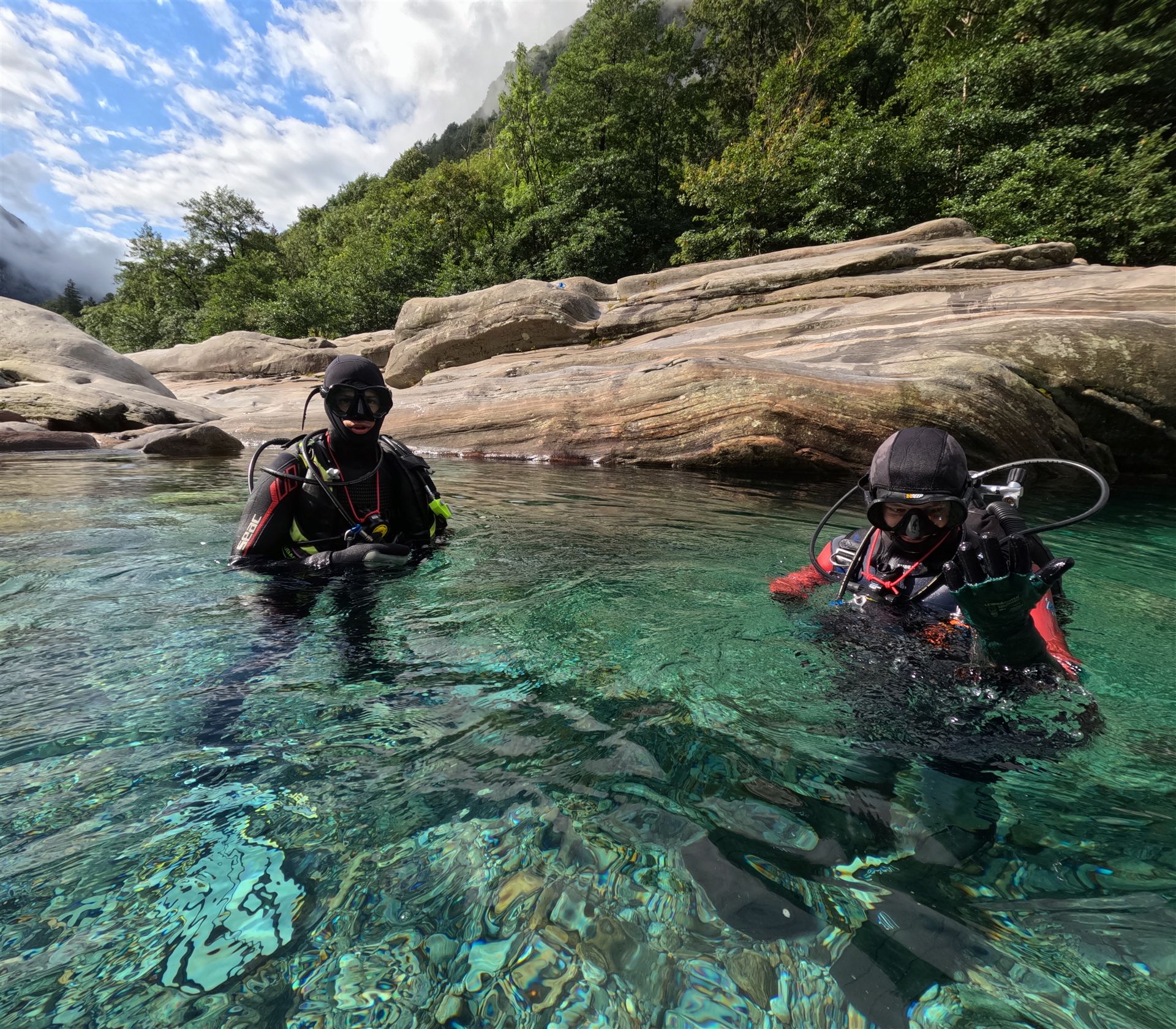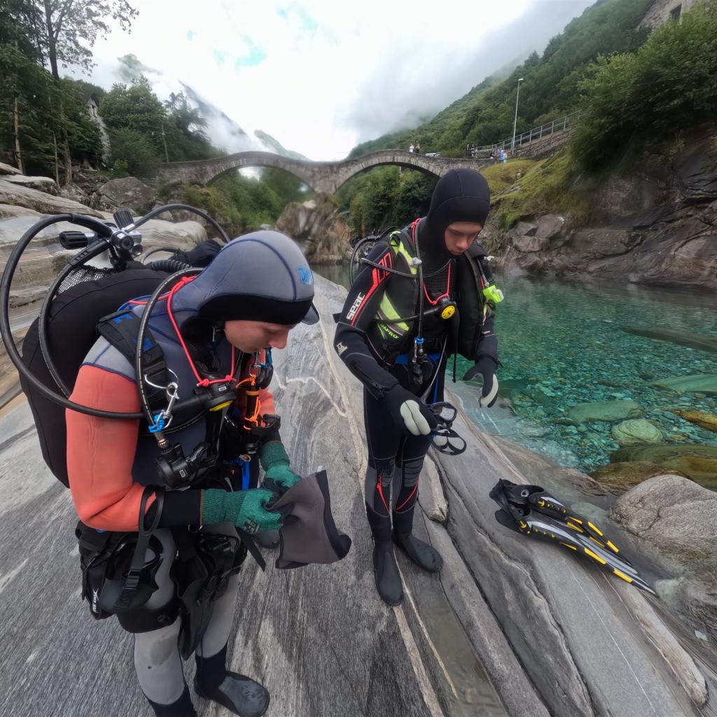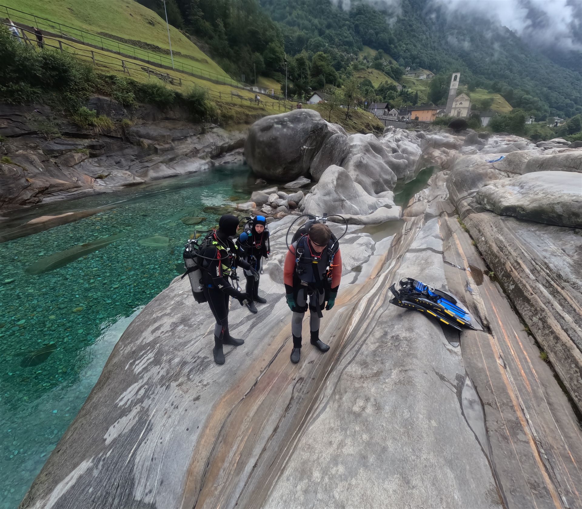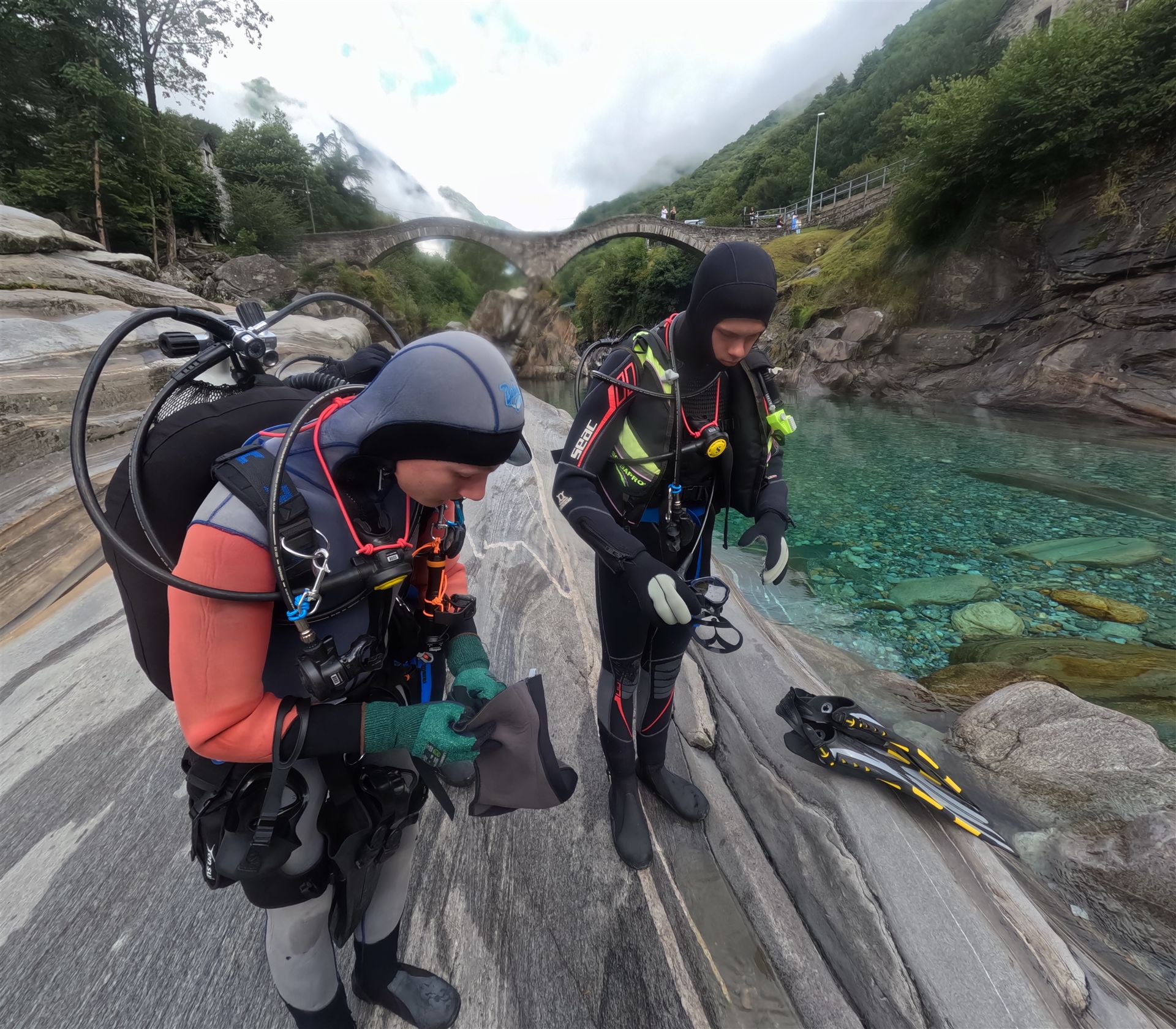 Nachdem wir mit der Jugendgruppe unseres Vereins knapp zwei Wochen beim Tauchcamp auf der Insel Giglio verbracht hatten, ging es wieder zurück nach Hause. Zwischenübernachtung machten wir in der Südschweiz. Zum einen ist das die Hälfte der Strecke und macht die lange Autofahrt etwas erträglicher. Der Ort bei Locarno wurde aber auch aufgrund eines besonderen Tauchplatzes gemacht, den man dort erleben kann: der Fluss Verzasca. Die Jahreszeit war optimal, die Verzasca führte genug Wasser für einen problemlosen Tauchgang. Andererseits war der Wasserstand und damit die Fließgeschwindigkeit niedrig genug, um ohne Sicherheitsleine tauchen zu können. Auch das Schwimmen gegen die Strömung war mit etwas Flosseneinsatz problemlos möglich und die Wassertemperatur mit angenehmen 15 Grad deutlich höher als erwartet. Als Tauchplatz hatten wir uns die Römerbrücke (ital. ponte dei salti, Brücke der Sprünge) ausgesucht. Zwischen einem Wasserfall und einer Flachstelle im Fluss gab es ein etwa 100 Meter langes und maximal neun Meter tiefes Becken, in dem wir abtauchen konnten. Der Abstieg zum Fluss mit der Ausrüstung auf dem Rücken war eine kleine Herausforderung.