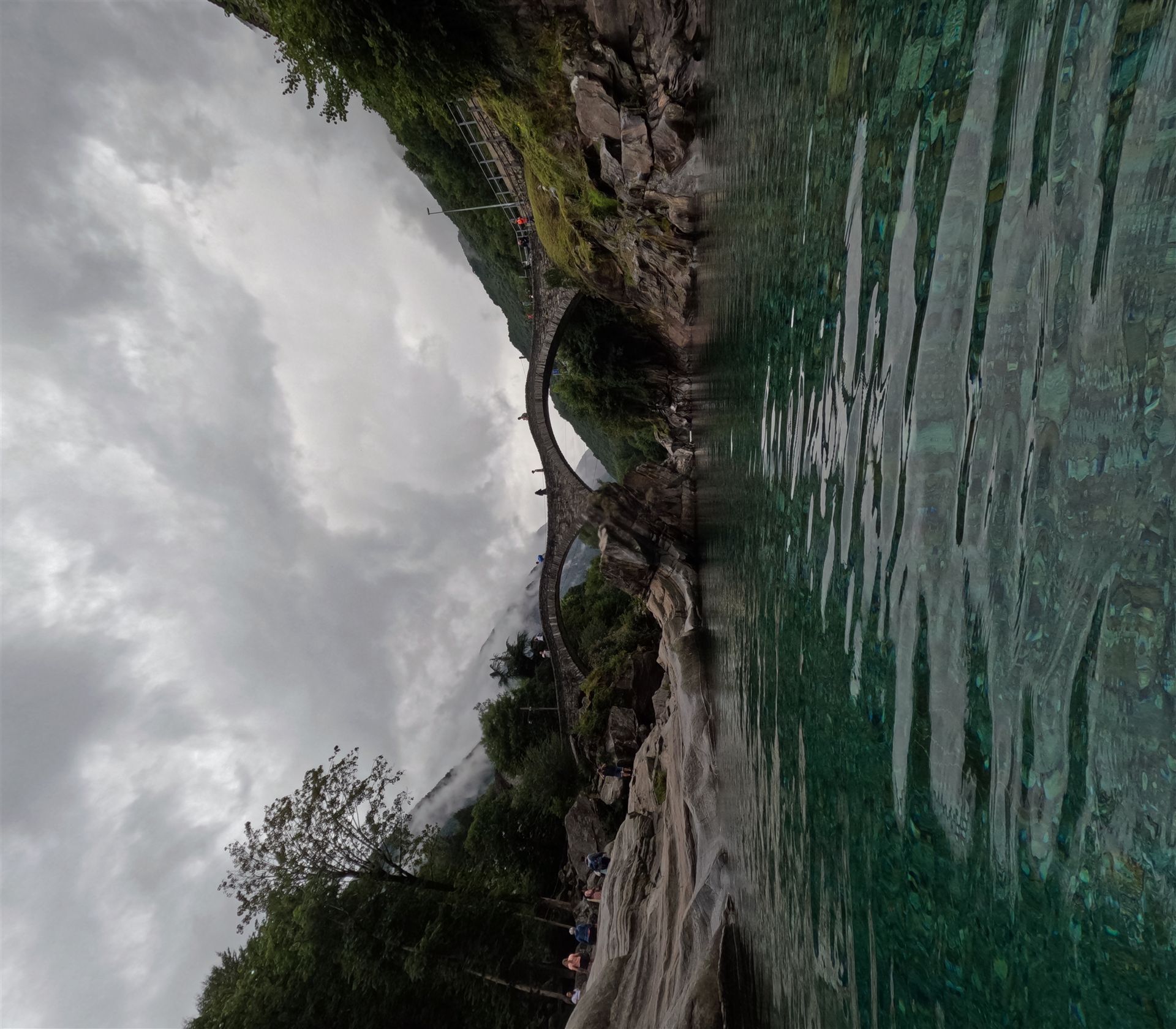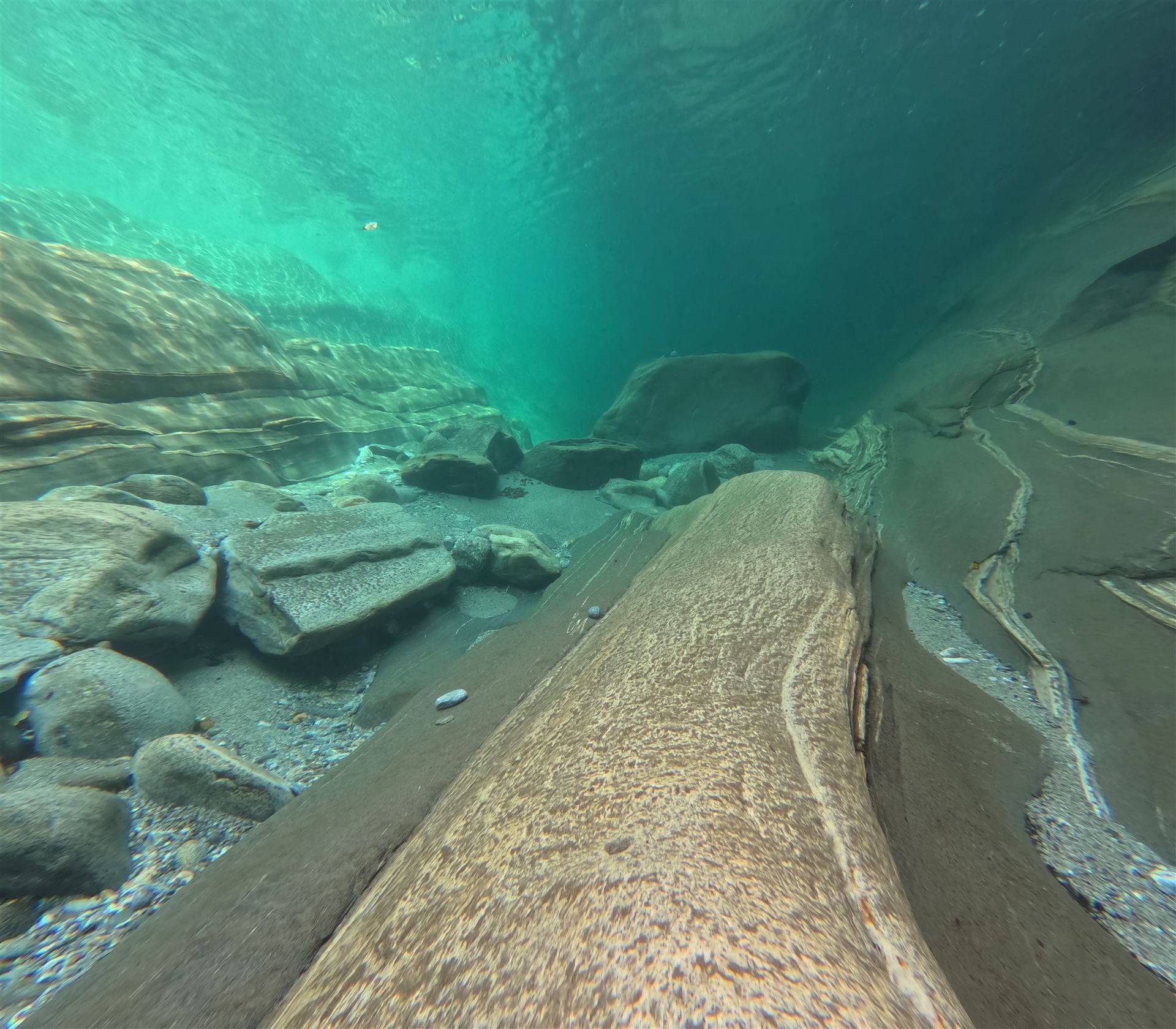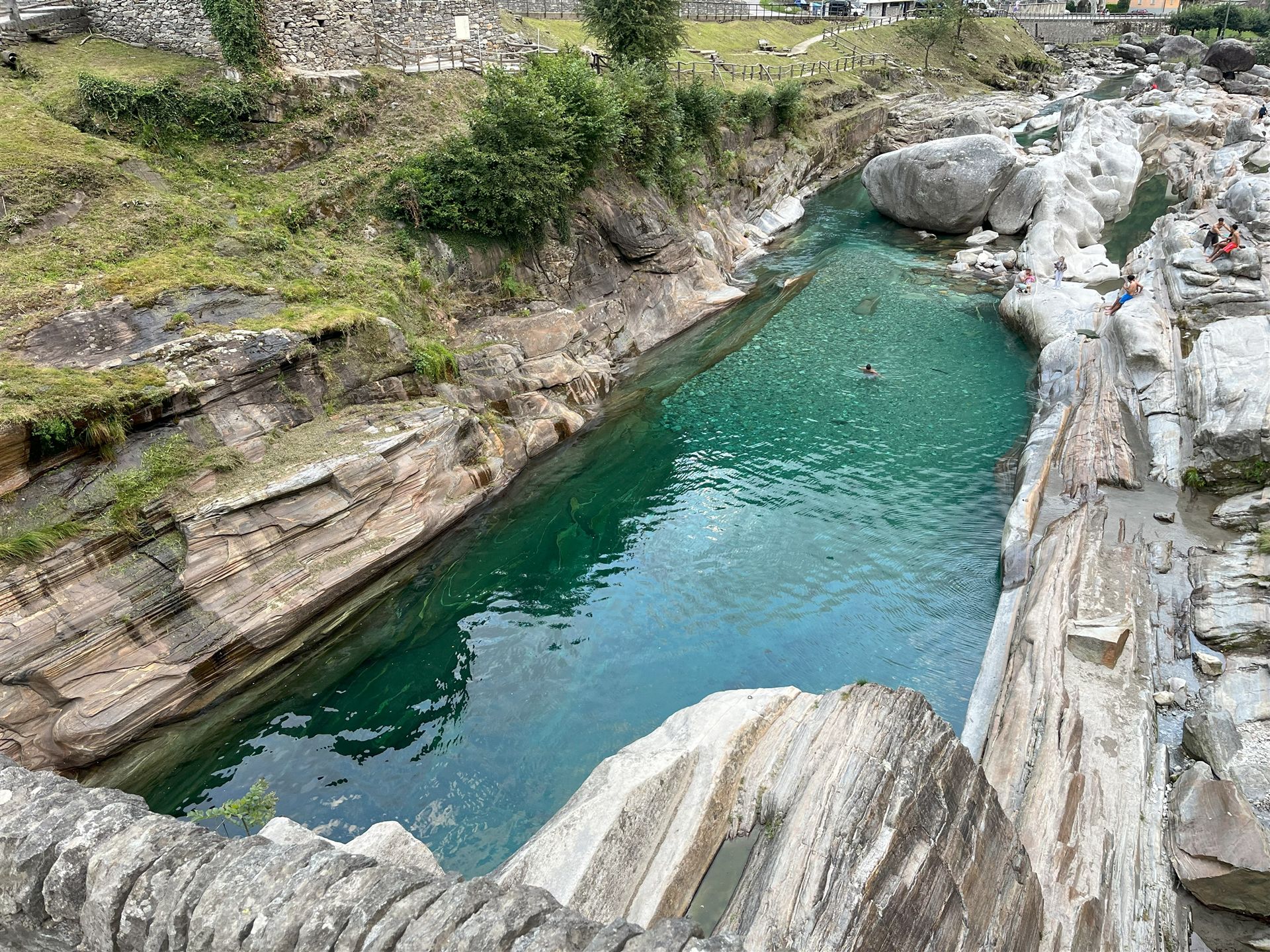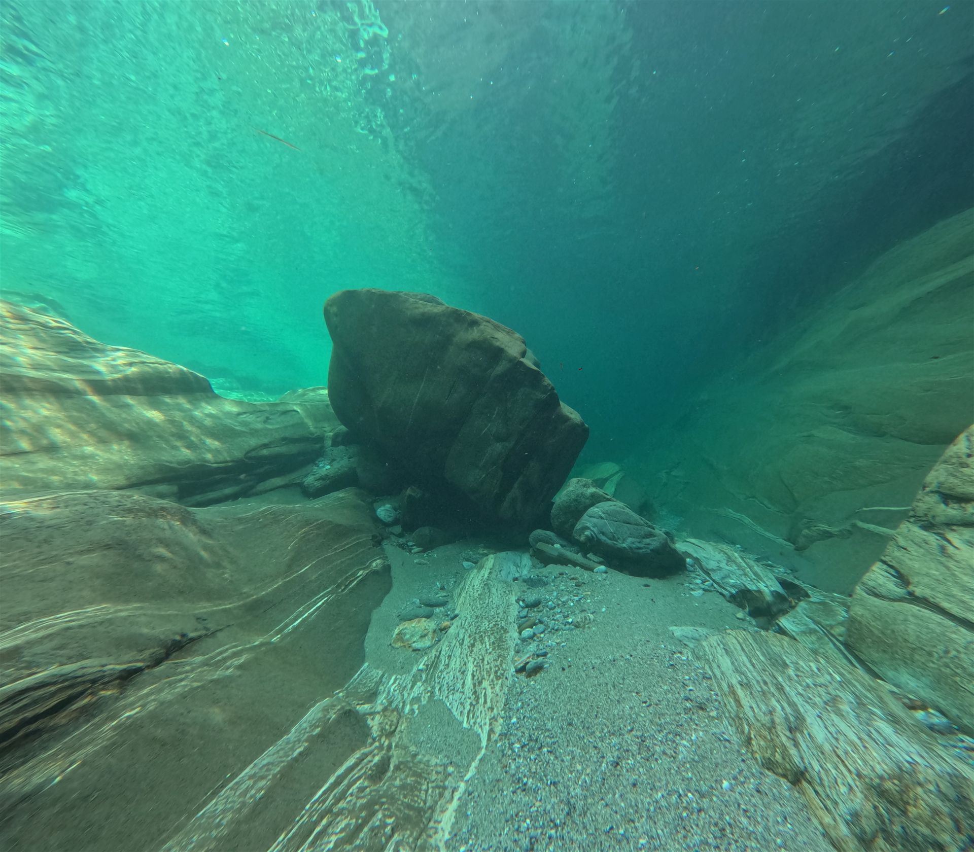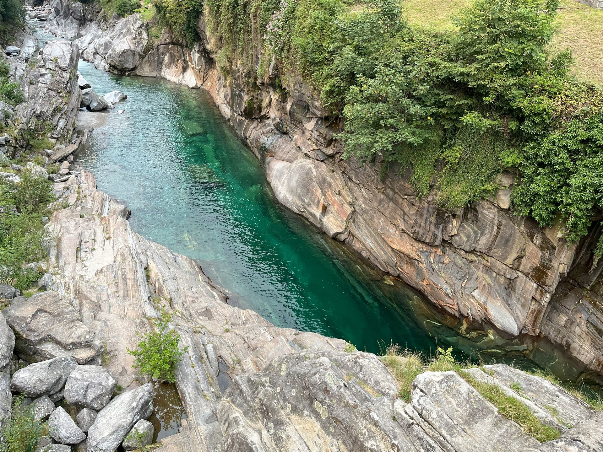 Nachdem wir mit der Jugendgruppe unseres Vereins knapp zwei Wochen beim Tauchcamp auf der Insel Giglio verbracht hatten, ging es wieder zurück nach Hause. Zwischenübernachtung machten wir in der Südschweiz. Zum einen ist das die Hälfte der Strecke und macht die lange Autofahrt etwas erträglicher. Der Ort bei Locarno wurde aber auch aufgrund eines besonderen Tauchplatzes gemacht, den man dort erleben kann: der Fluss Verzasca. Die Jahreszeit war optimal, die Verzasca führte genug Wasser für einen problemlosen Tauchgang. Andererseits war der Wasserstand und damit die Fließgeschwindigkeit niedrig genug, um ohne Sicherheitsleine tauchen zu können. Auch das Schwimmen gegen die Strömung war mit etwas Flosseneinsatz problemlos möglich und die Wassertemperatur mit angenehmen 15 Grad deutlich höher als erwartet. Als Tauchplatz hatten wir uns die Römerbrücke (ital. ponte dei salti, Brücke der Sprünge) ausgesucht. Zwischen einem Wasserfall und einer Flachstelle im Fluss gab es ein etwa 100 Meter langes und maximal neun Meter tiefes Becken, in dem wir abtauchen konnten. Der Abstieg zum Fluss mit der Ausrüstung auf dem Rücken war eine kleine Herausforderung.