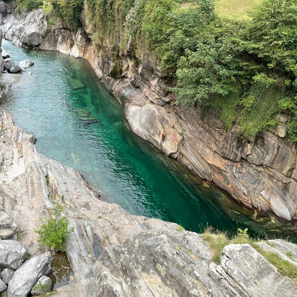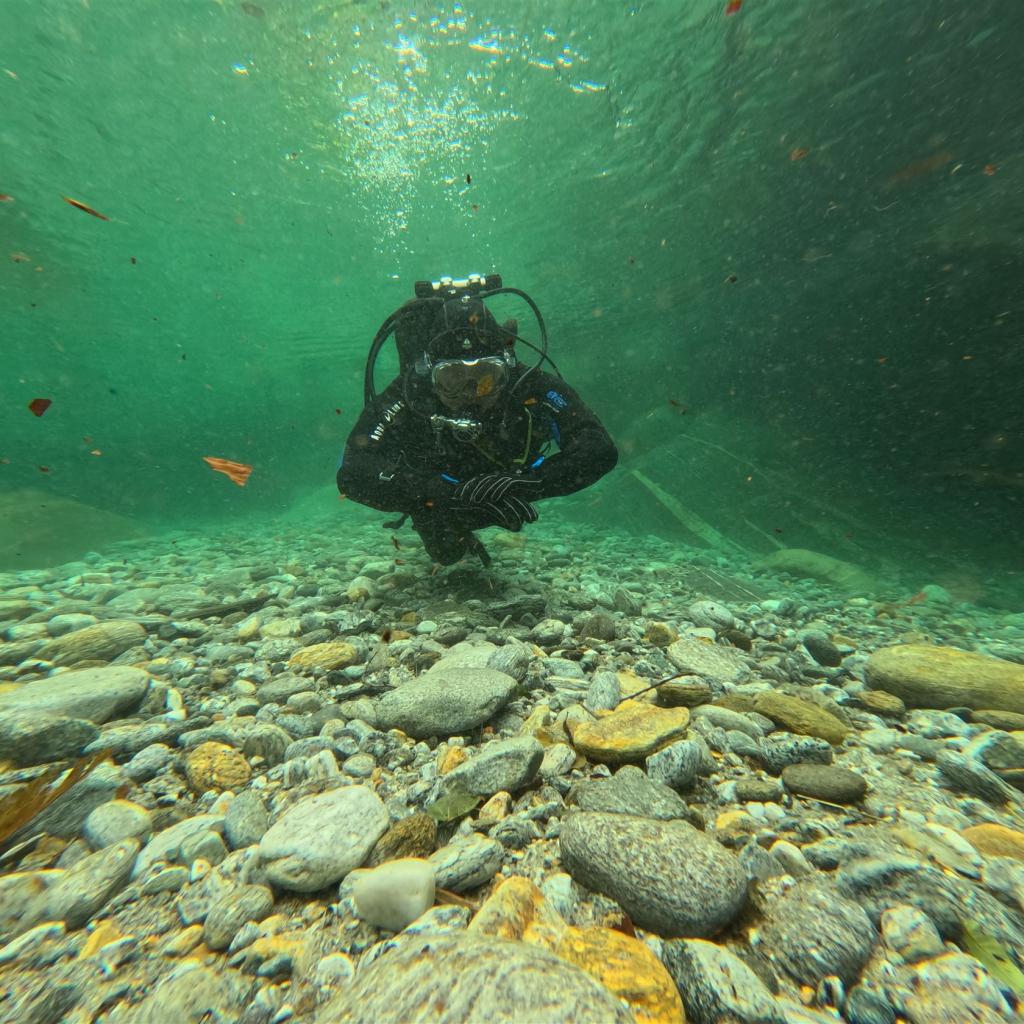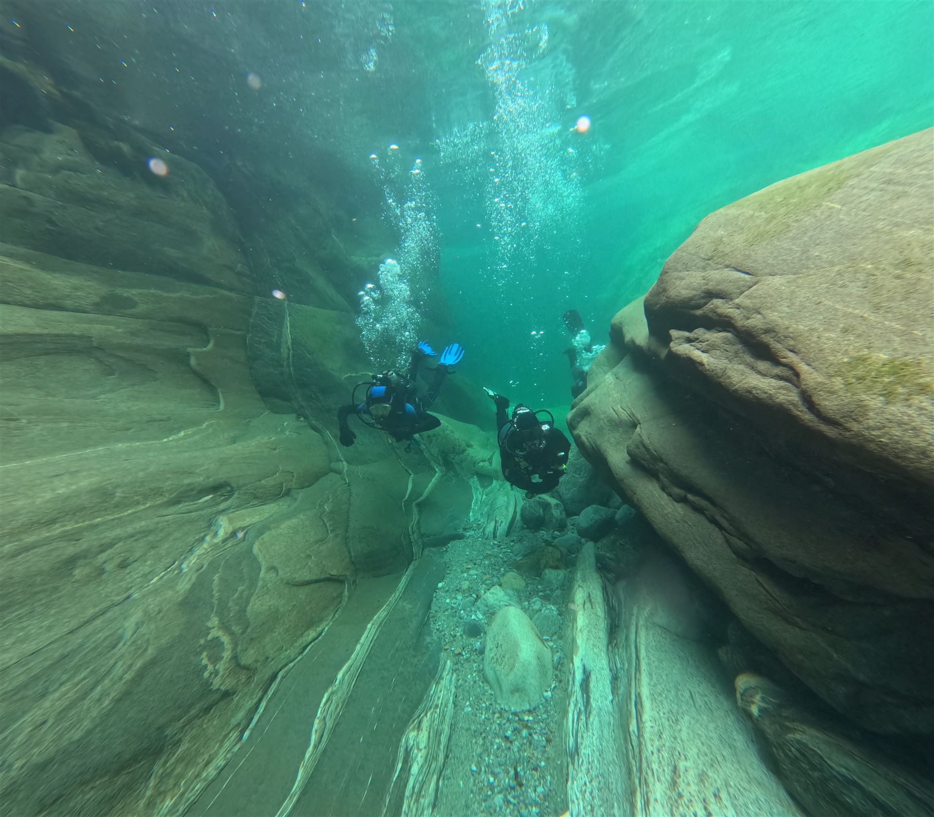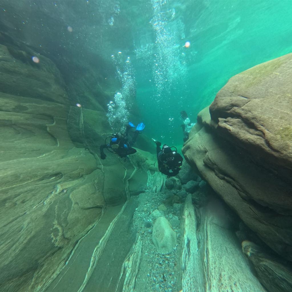 Nachdem wir mit der Jugendgruppe unseres Vereins knapp zwei Wochen beim Tauchcamp auf der Insel Giglio verbracht hatten, ging es wieder zurück nach Hause. Zwischenübernachtung machten wir in der Südschweiz. Zum einen ist das die Hälfte der Strecke und macht die lange Autofahrt etwas erträglicher. Der Ort bei Locarno wurde aber auch aufgrund eines besonderen Tauchplatzes gemacht, den man dort erleben kann: der Fluss Verzasca. Die Jahreszeit war optimal, die Verzasca führte genug Wasser für einen problemlosen Tauchgang. Andererseits war der Wasserstand und damit die Fließgeschwindigkeit niedrig genug, um ohne Sicherheitsleine tauchen zu können. Auch das Schwimmen gegen die Strömung war mit etwas Flosseneinsatz problemlos möglich und die Wassertemperatur mit angenehmen 15 Grad deutlich höher als erwartet. Als Tauchplatz hatten wir uns die Römerbrücke (ital. ponte dei salti, Brücke der Sprünge) ausgesucht. Zwischen einem Wasserfall und einer Flachstelle im Fluss gab es ein etwa 100 Meter langes und maximal neun Meter tiefes Becken, in dem wir abtauchen konnten. Der Abstieg zum Fluss mit der Ausrüstung auf dem Rücken war eine kleine Herausforderung.