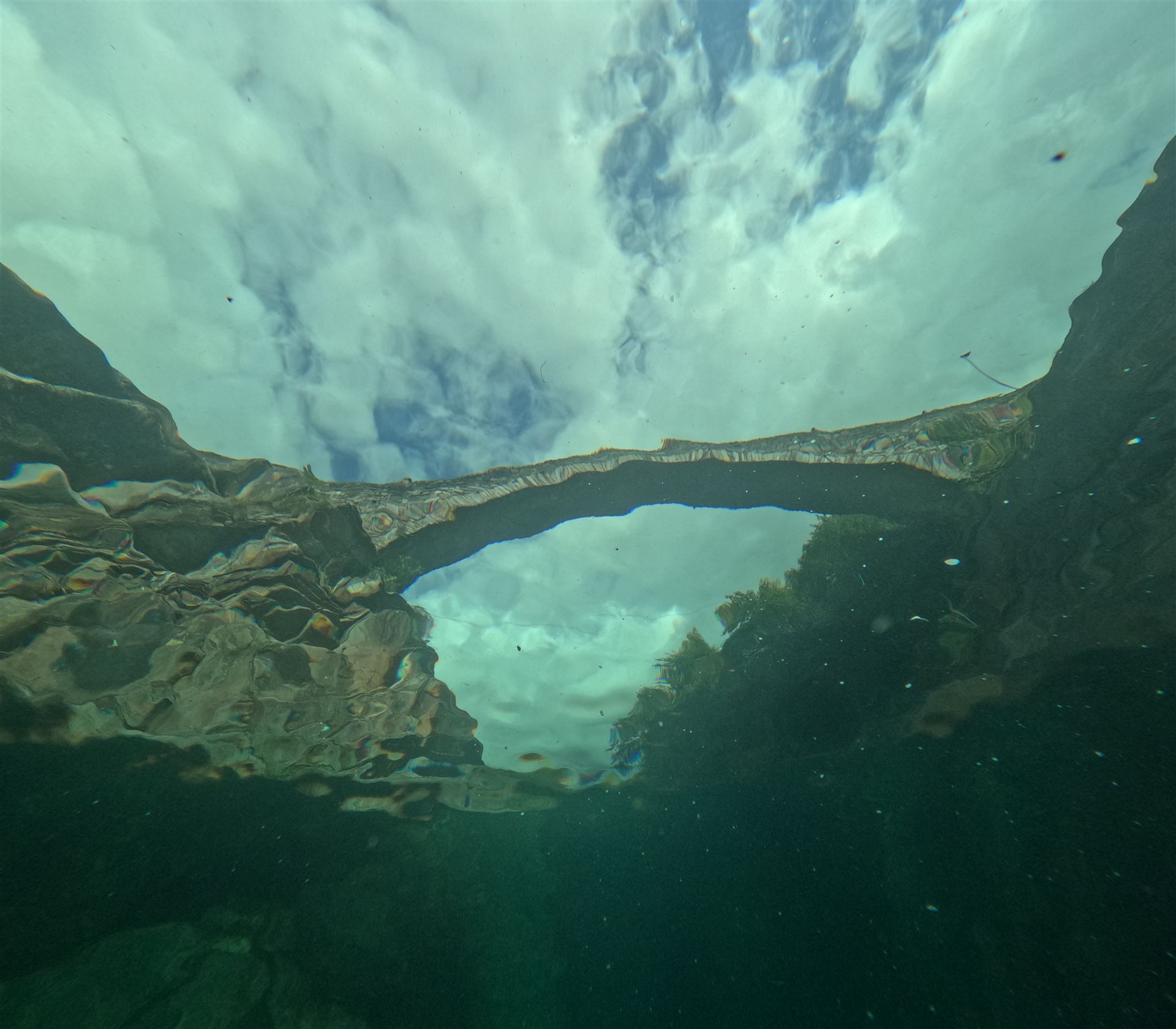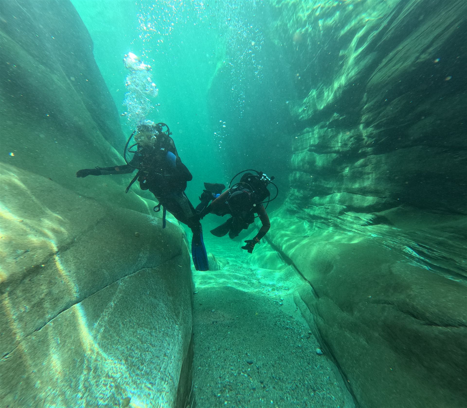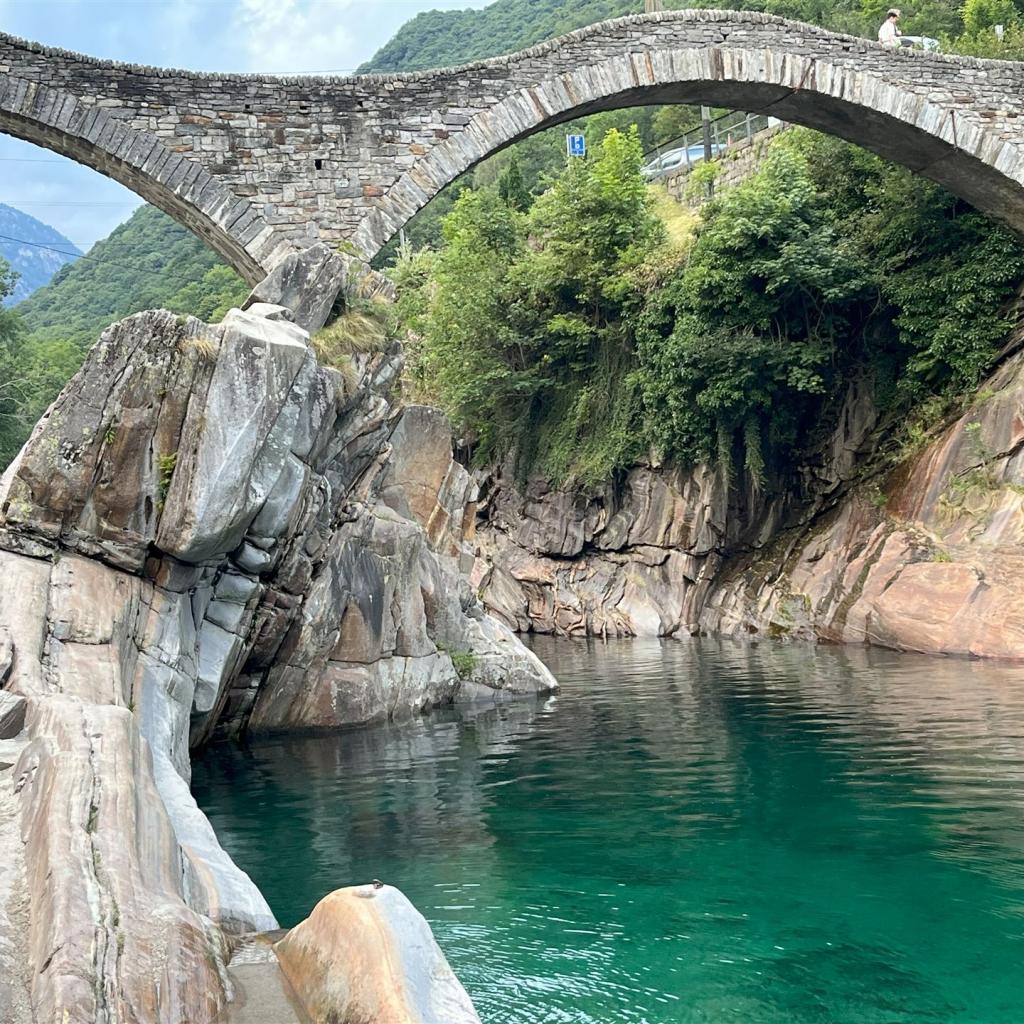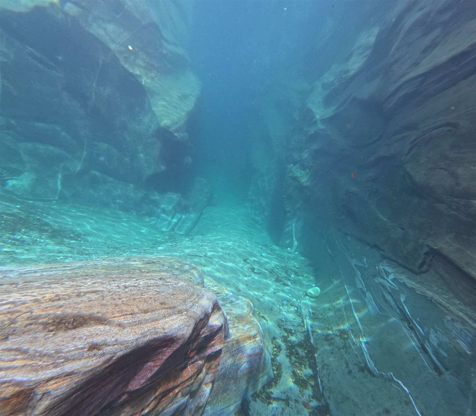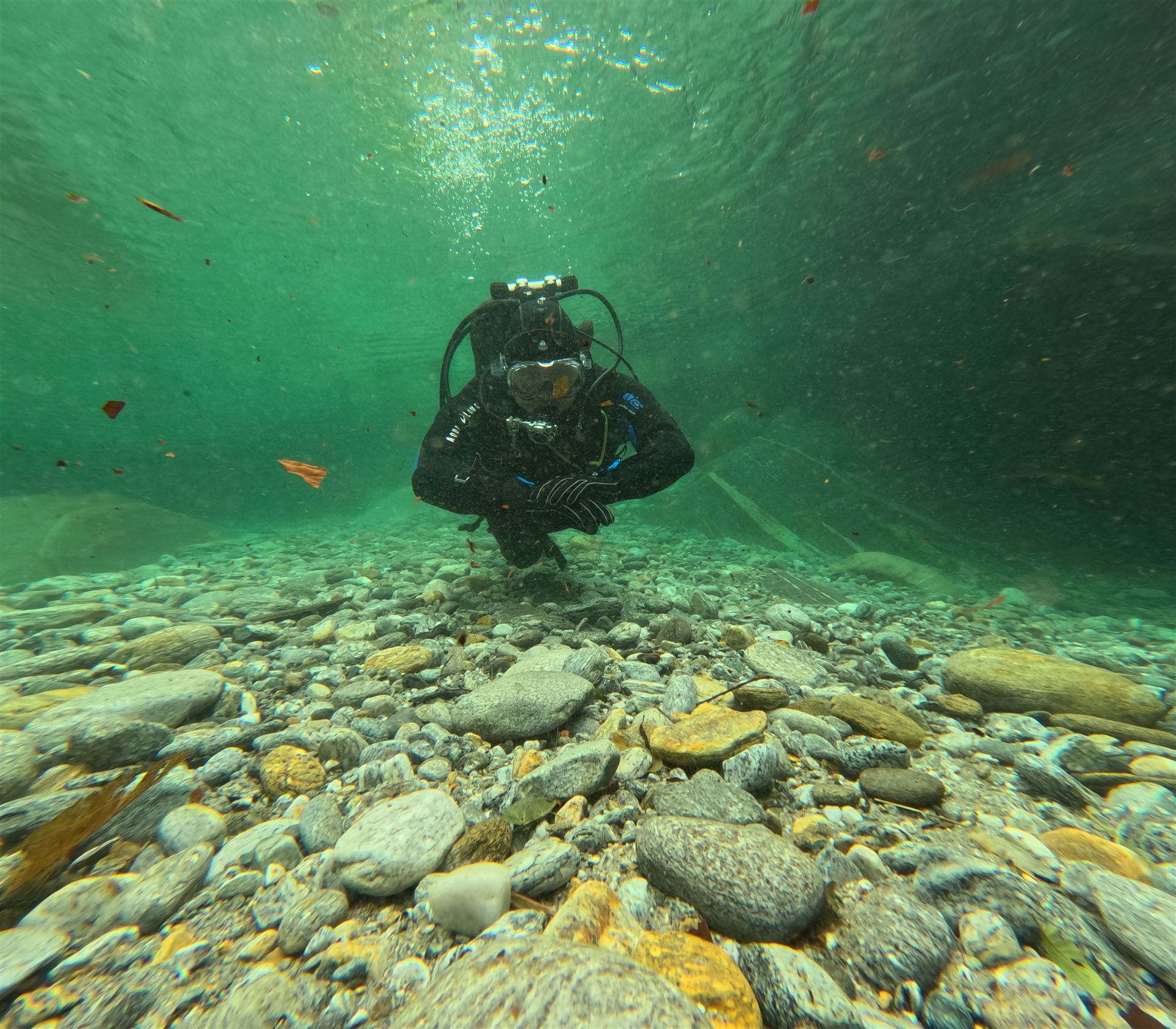 Nachdem wir mit der Jugendgruppe unseres Vereins knapp zwei Wochen beim Tauchcamp auf der Insel Giglio verbracht hatten, ging es wieder zurück nach Hause. Zwischenübernachtung machten wir in der Südschweiz. Zum einen ist das die Hälfte der Strecke und macht die lange Autofahrt etwas erträglicher. Der Ort bei Locarno wurde aber auch aufgrund eines besonderen Tauchplatzes gemacht, den man dort erleben kann: der Fluss Verzasca. Die Jahreszeit war optimal, die Verzasca führte genug Wasser für einen problemlosen Tauchgang. Andererseits war der Wasserstand und damit die Fließgeschwindigkeit niedrig genug, um ohne Sicherheitsleine tauchen zu können. Auch das Schwimmen gegen die Strömung war mit etwas Flosseneinsatz problemlos möglich und die Wassertemperatur mit angenehmen 15 Grad deutlich höher als erwartet. Als Tauchplatz hatten wir uns die Römerbrücke (ital. ponte dei salti, Brücke der Sprünge) ausgesucht. Zwischen einem Wasserfall und einer Flachstelle im Fluss gab es ein etwa 100 Meter langes und maximal neun Meter tiefes Becken, in dem wir abtauchen konnten. Der Abstieg zum Fluss mit der Ausrüstung auf dem Rücken war eine kleine Herausforderung.