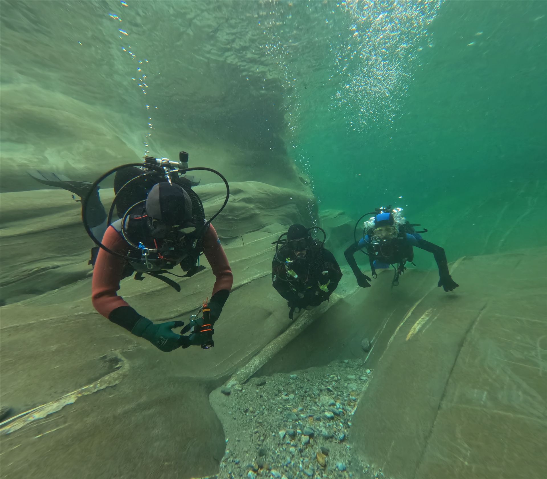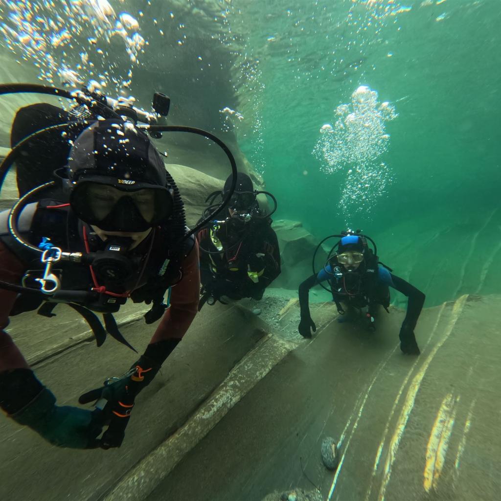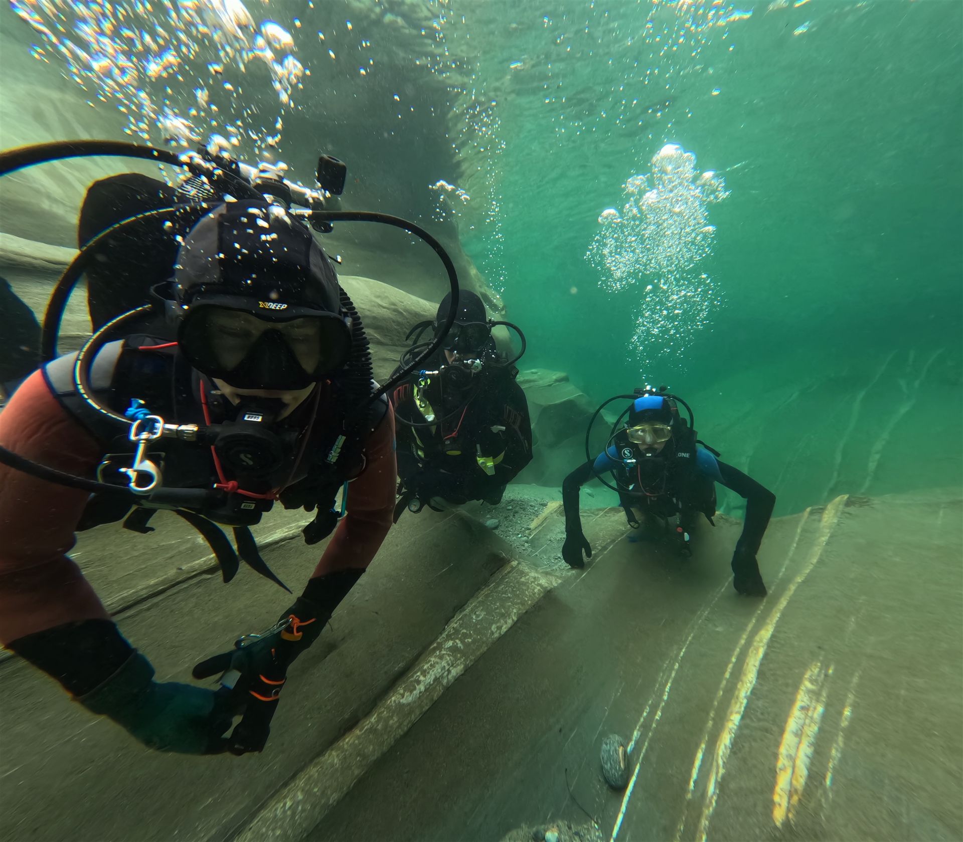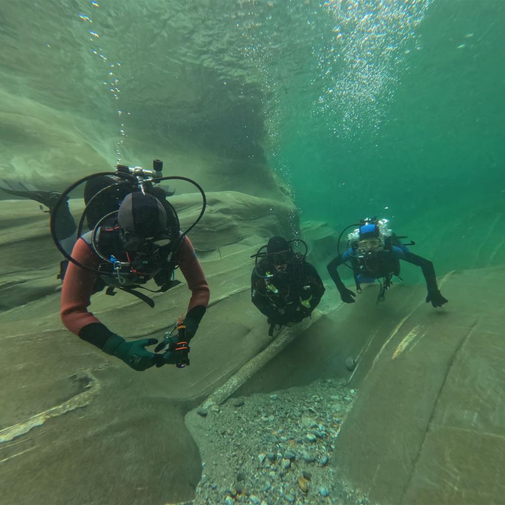 Nachdem wir mit der Jugendgruppe unseres Vereins knapp zwei Wochen beim Tauchcamp auf der Insel Giglio verbracht hatten, ging es wieder zurück nach Hause. Zwischenübernachtung machten wir in der Südschweiz. Zum einen ist das die Hälfte der Strecke und macht die lange Autofahrt etwas erträglicher. Der Ort bei Locarno wurde aber auch aufgrund eines besonderen Tauchplatzes gemacht, den man dort erleben kann: der Fluss Verzasca. Die Jahreszeit war optimal, die Verzasca führte genug Wasser für einen problemlosen Tauchgang. Andererseits war der Wasserstand und damit die Fließgeschwindigkeit niedrig genug, um ohne Sicherheitsleine tauchen zu können. Auch das Schwimmen gegen die Strömung war mit etwas Flosseneinsatz problemlos möglich und die Wassertemperatur mit angenehmen 15 Grad deutlich höher als erwartet. Als Tauchplatz hatten wir uns die Römerbrücke (ital. ponte dei salti, Brücke der Sprünge) ausgesucht. Zwischen einem Wasserfall und einer Flachstelle im Fluss gab es ein etwa 100 Meter langes und maximal neun Meter tiefes Becken, in dem wir abtauchen konnten. Der Abstieg zum Fluss mit der Ausrüstung auf dem Rücken war eine kleine Herausforderung.